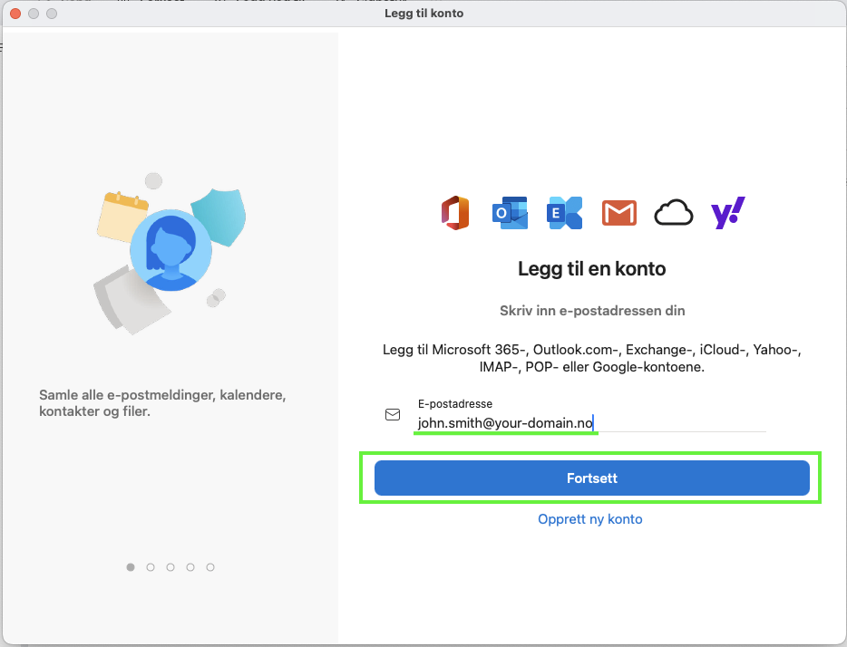 I denne guiden viser vi hvordan du legger til din e-postkonto i Microsoft Outlook på Mac. Før du starter å legge inn kontoen du har opprettet eller fått informasjon om kan det være smart å logge inn på vår webmail for å se at du har riktig e-post/bruker og passord.