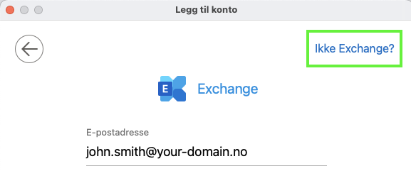 - I noen tilfeller kan du få opp dette vinduet. Velg da "Ikke Exchange?" øverst til venstre.