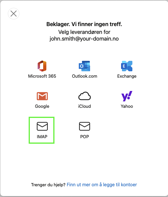 - Velg "IMAP" for type konto.