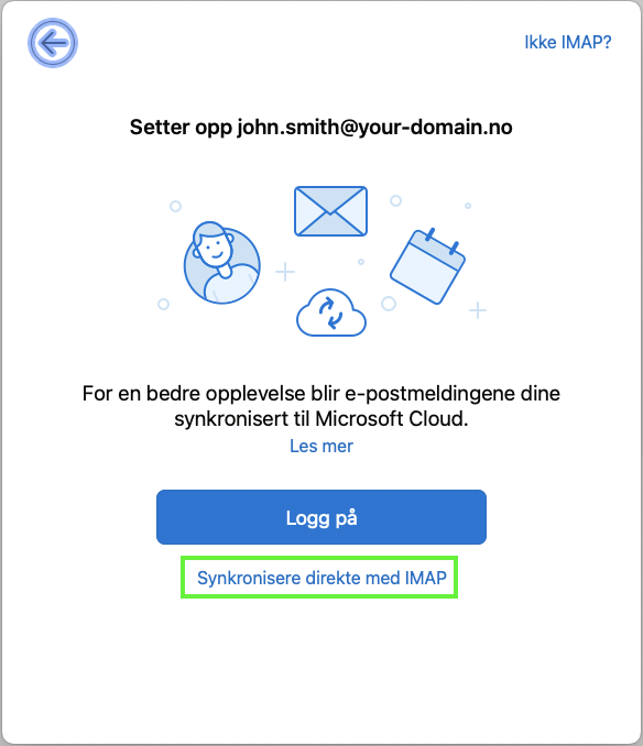 - Microsoft Outlook tilbyr deg å synkronisere data med Microsoft Cloud. Vi har valgt å ikke gjøre dette ved å klikke "Synkroniser direkte med IMAP".