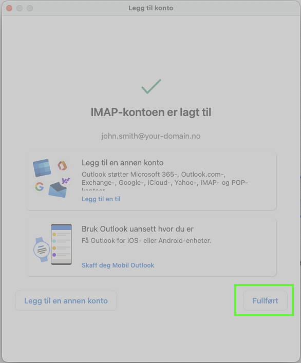 - Din konto er nå lagt til. Du kan velge å legge til flere kontoer. Er du ferdig trykker du "Fullført".