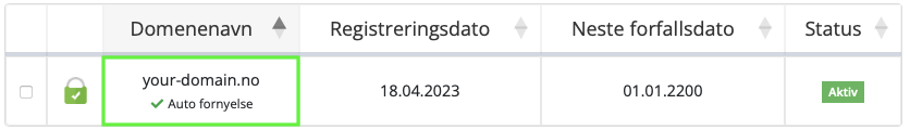 - Dersom ditt domenenavn har registrert data hos Norid vil det vises slik i oversikten. Dersom date er korrekt vil det og vises i en grønn boks at data er synkronisert.