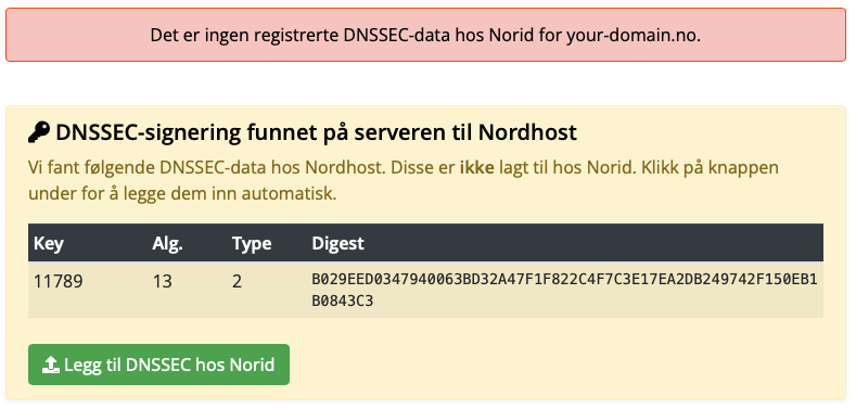 - Dersom det ikke er registrert DNSSEC data for ditt domenenavn vil du få en rød advarsel. Om du benytter Nordhost navneservere vil du samtidig få forslag om å legge til riktig DNSSEC data.