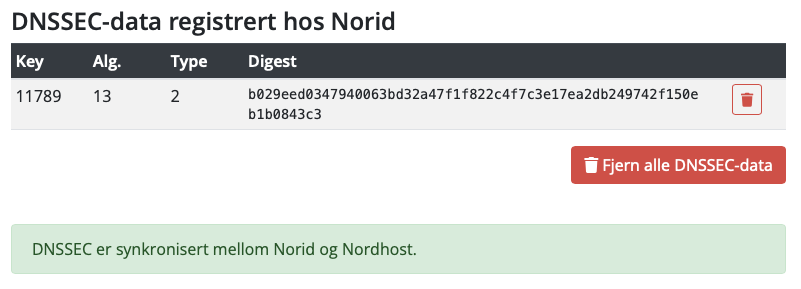 DNSSEC fungerer som et ekstra sikkerhetslag og beskytter domenenavnet ditt mot forfalskede DNS-svar. Dette øker sikkerheten for besøkende på din nettside. Dersom oppføringene ikke stemmer mellom Norid og våre servere, kan nettsiden eller e-post slutte å fungere. Sørg derfor for at DNSSEC-dataene her alltid er oppdaterte for å unngå problemer med tilkobling og sikkerhet.