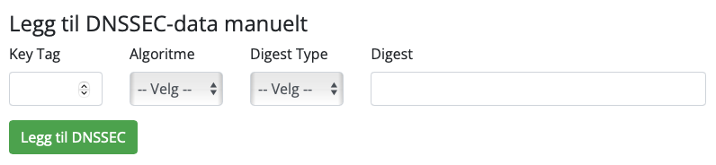 - Med ekstern navneserver vil du få et skjema for å manuelt legge inn DNSSEC-data. Her er det viktig at du fyller ut helt korrekt for at ditt domenenavn skal fungere på internett.
