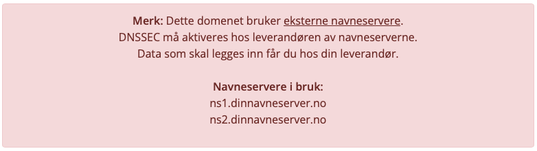- Om du benytter eksterne navneservere vil du få en rød advarsel. Om du i et slikt tilfelle ønsker å legge til DNSSEC for ditt domenenavn må du få korrekt informasjon fra leverandøren av navneserverne. Denne informasjon har vi ikke hos oss i Nordhost.