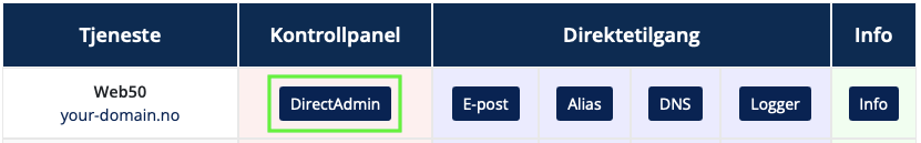 - Klikk på "DirectAdmin" bak det domenenavnet du vil administrere.