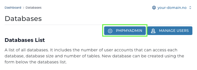 - Øverst til høyre er det en knapp for "PHPMYADMIN".